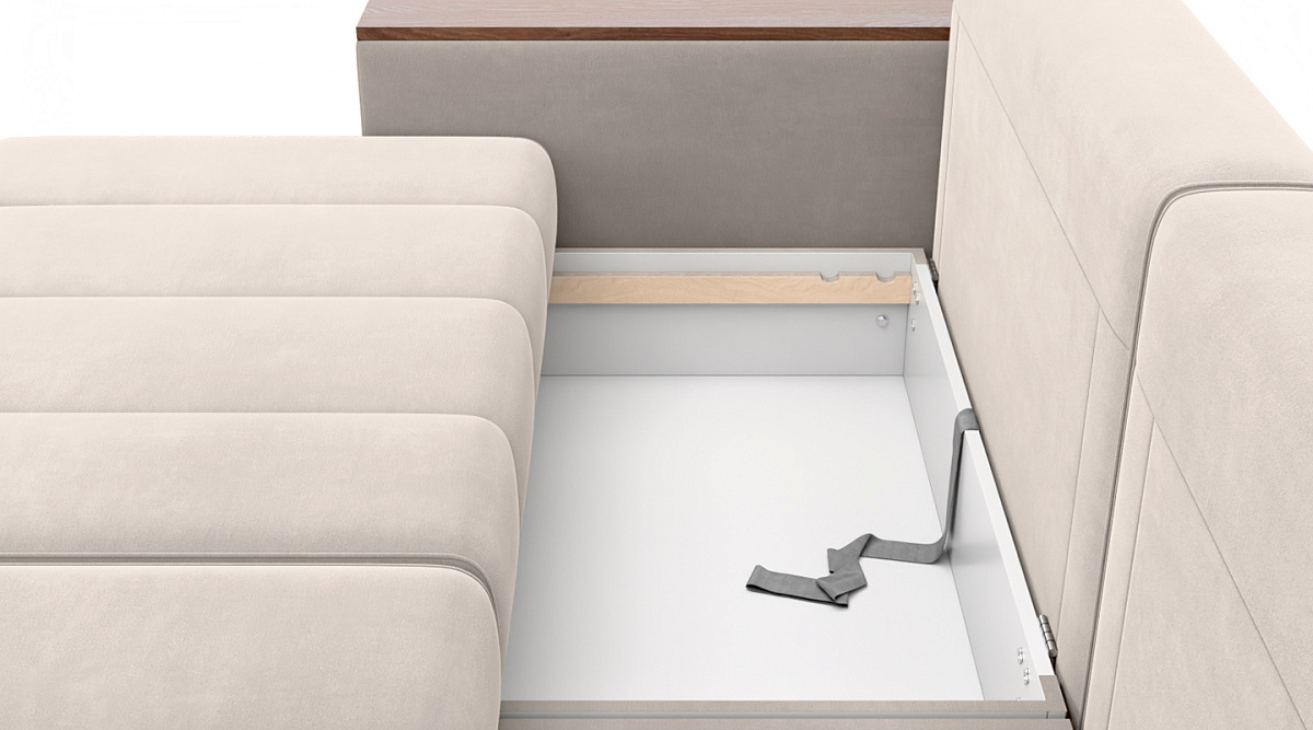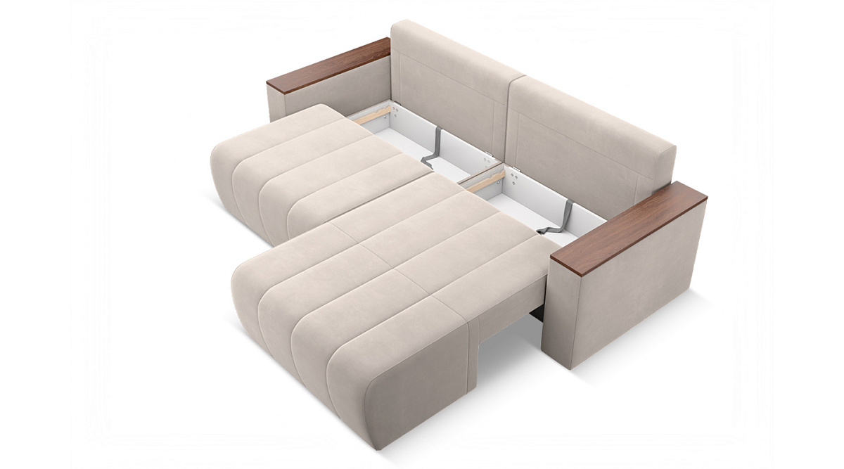 Надежный и простой в использовании. Благодаря отсутствию петель на стыке спальная поверхность получается ровной и удобной. Постель располагается вдоль дивана и не занимает много места при раскладывании, что идеально для интерьера узких помещений. Еще один плюс: в отличие от классических диванов-«книжек», «еврокнижку» не нужно отодвигать от стены каждый раз при раскладывании – конструкция модели выдвигается вперед.