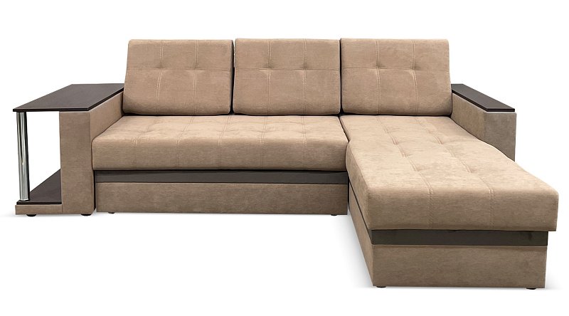 Диван легко раскладывается с помощью механизма трансформации “дельфин”. Получается абсолютно ровная поверхность без ямок и переходов по высоте - то есть полноценное спальное место, рассчитанное на двух человек. В основе наполнителя независимый пружинный блок и высококачественный ППУ. Украшают “Атланту” хромированные ножки встроенного столика.